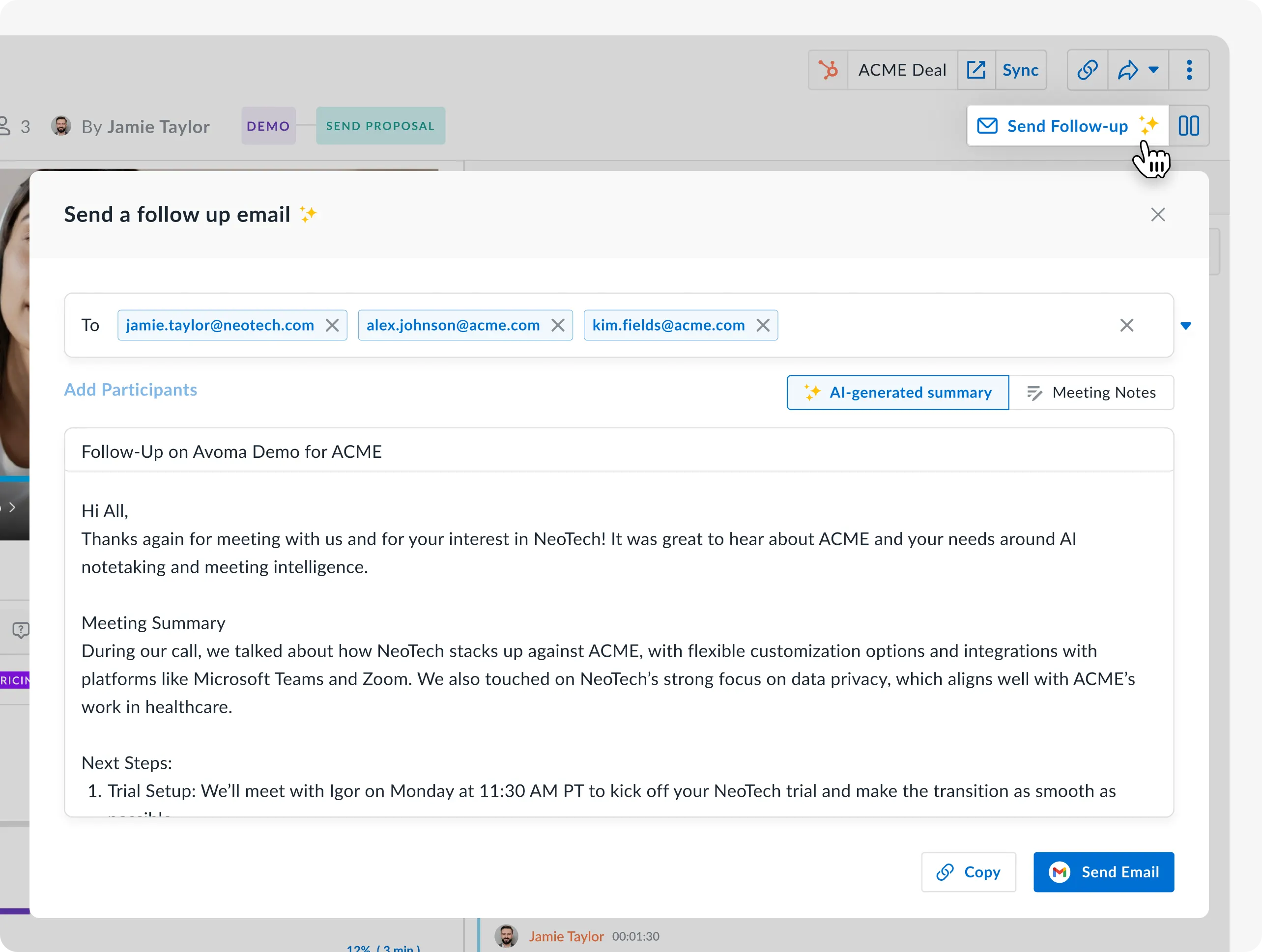 Avoma drafts a follow-up email after meeting using the transcript, decisions, and next steps. Review, edit, and send through Gmail or Outlook. The email logs to your CRM automatically.