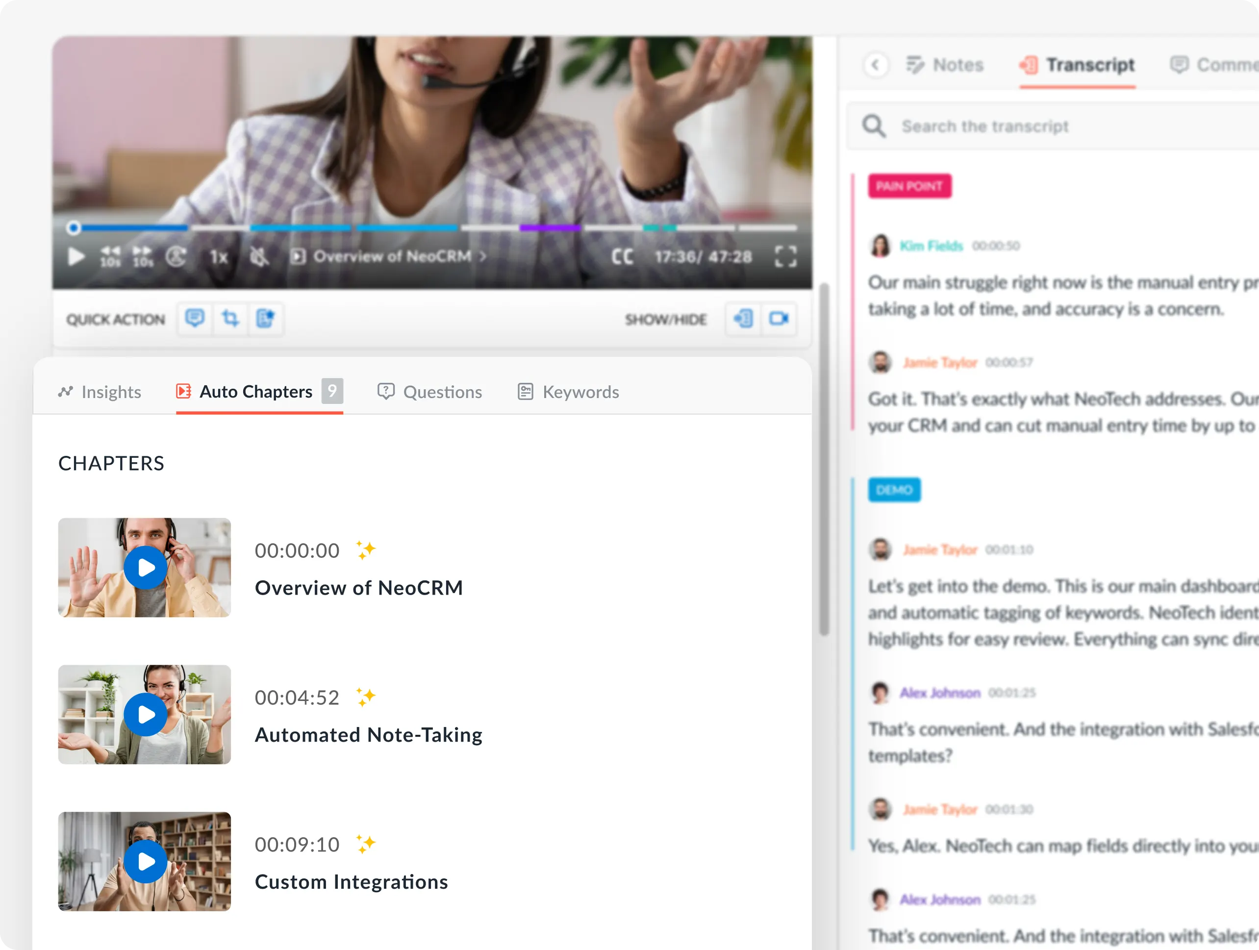 Search cloud meeting recordings by keyword or speaker. Share snippets on Slack. Review coaching moments from the recording. Transcripts sync to your CRM instantly