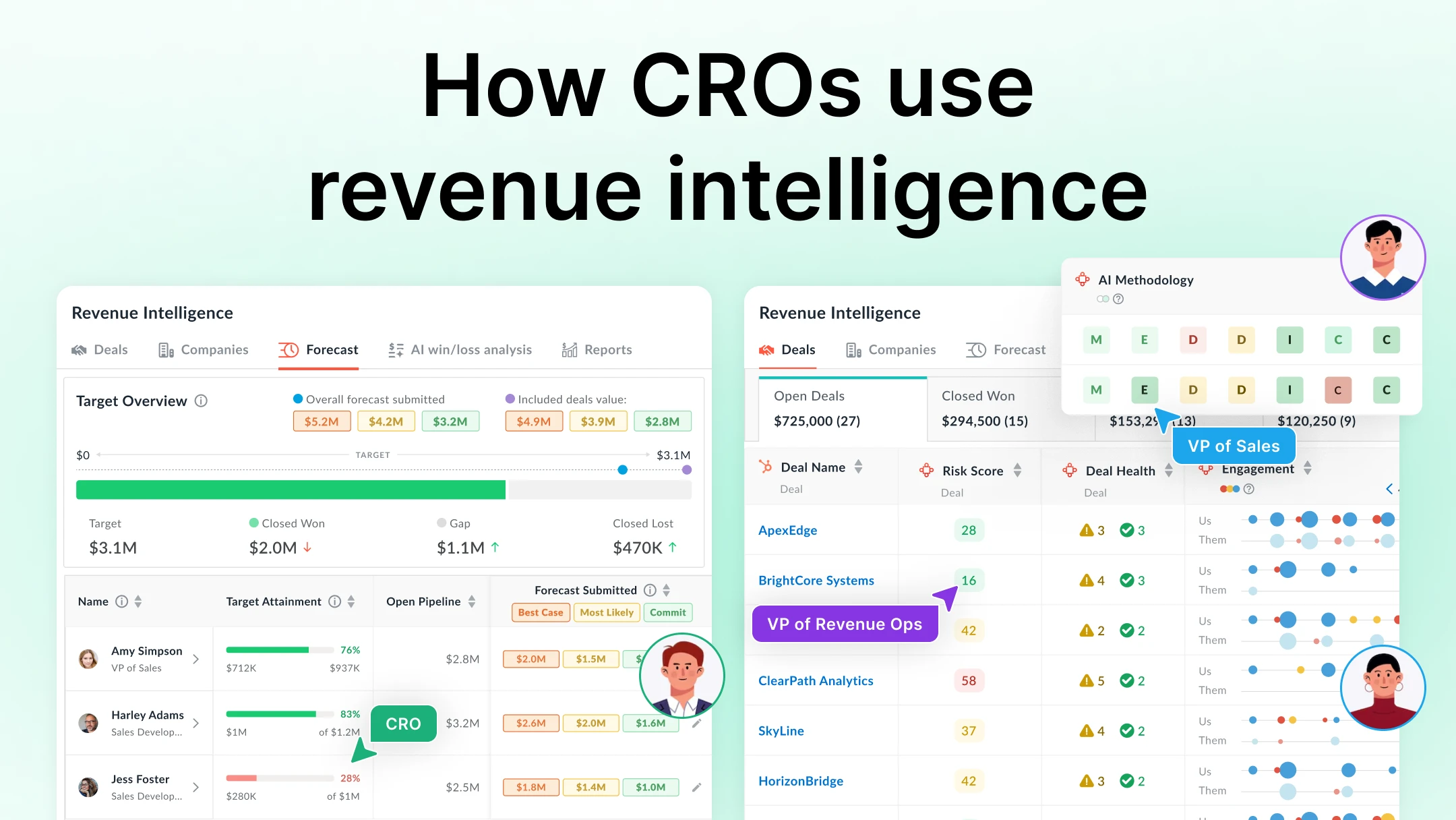 It taps into meetings, CRM activity, and rep behavior to model expected revenue in real time. You see which deals are on track, which ones are slipping, and how that affects your number, without needing to ask for another update.