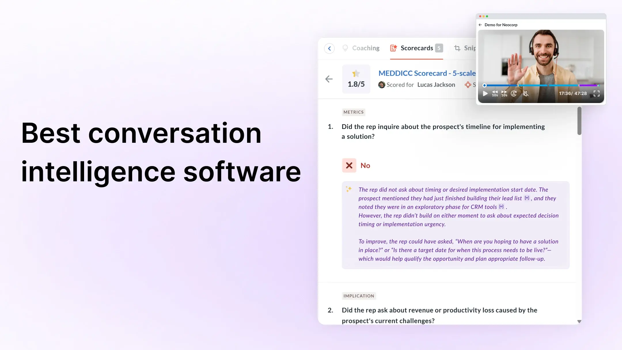 Choose Avoma if you want a full-suite solution with real-time coaching, live answer cards, customizable scorecards, and deep meeting analytics—all at an affordable price.