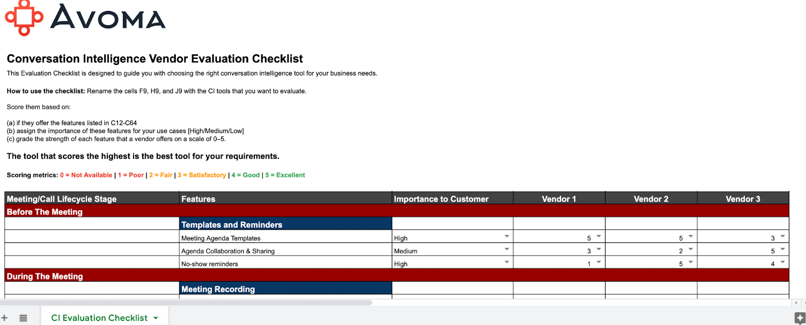 To help you choose the best conversation intelligence tool that maps to your unique requirements, we have created an Interactive Vendor Evaluation Checklist. We hope it’ll help you identify the right CI tool that best fits your use cases.