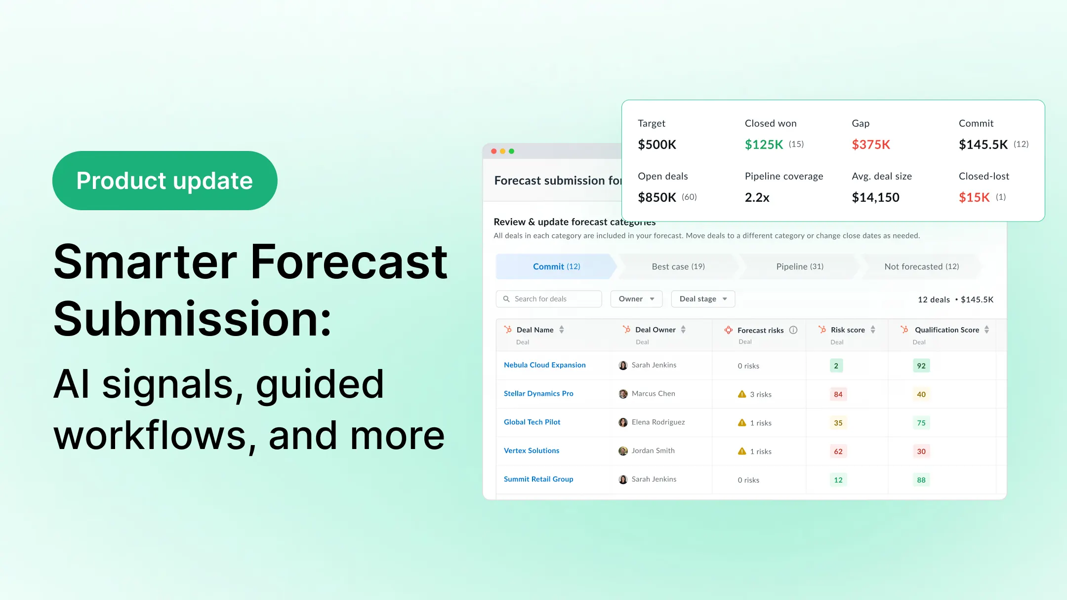 The forecast submission table now includes three new columns: Risk Score, Qualification Score, and Forecast Risks. They appear automatically alongside your existing deal details, so you can evaluate each deal on the spot — no toggling to another view, no cross-referencing a separate report.