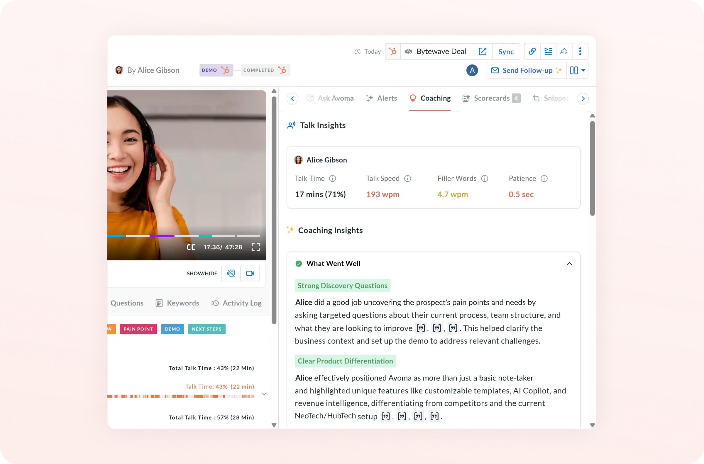 Avoma auto-scores calls objectively using frameworks like MEDDPICC and SPICED. Design scorecards around your methodology so coaching aligns with how your team sells.