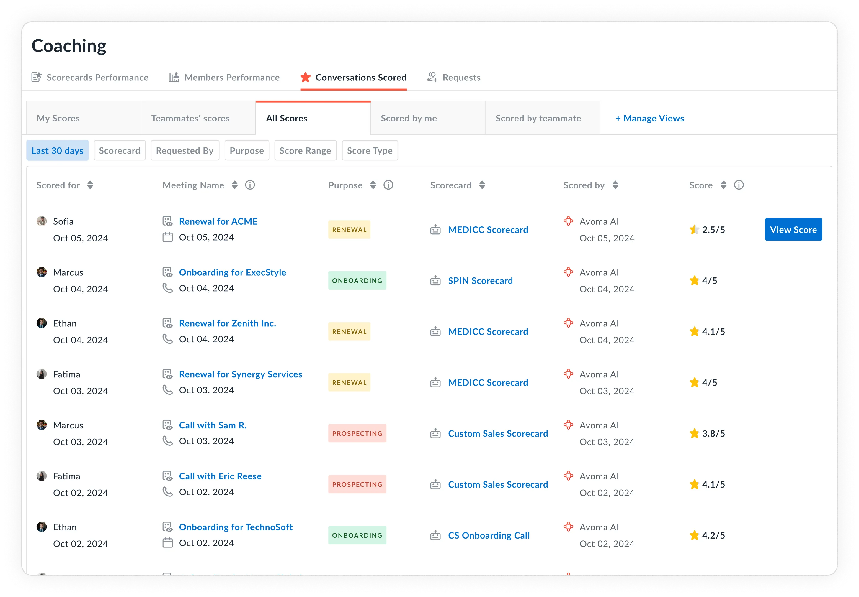 Avoma's sales call scoring software evaluates 100% of your team's calls using AI-powered scorecards built on MEDDIC, BANT, SPICED, or your own criteria. Managers get instant call quality scores, reasoning for ratings, and a prioritized list of calls that need coaching.