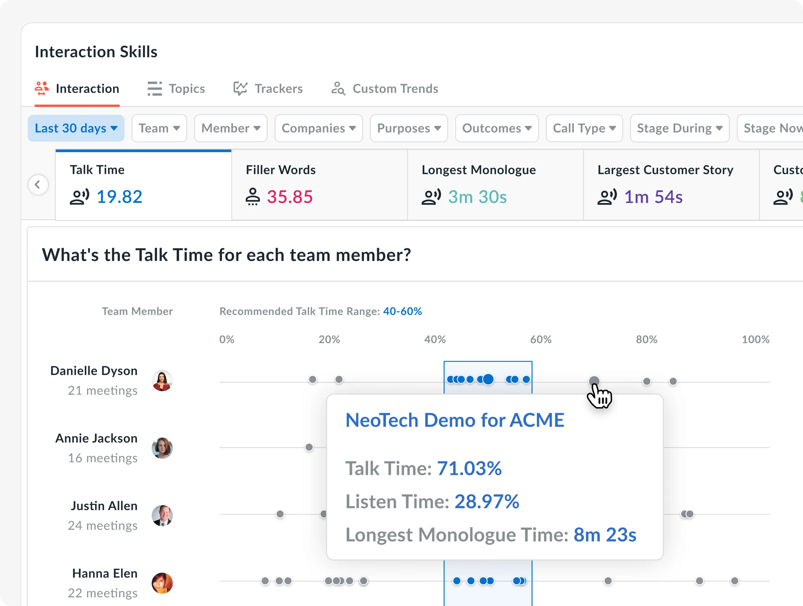 Avoma measures talk-to-listen ratio, monologue length, filler word frequency, and patience levels per speaker, per call. Managers benchmark these metrics against top performers to identify coachable habits.