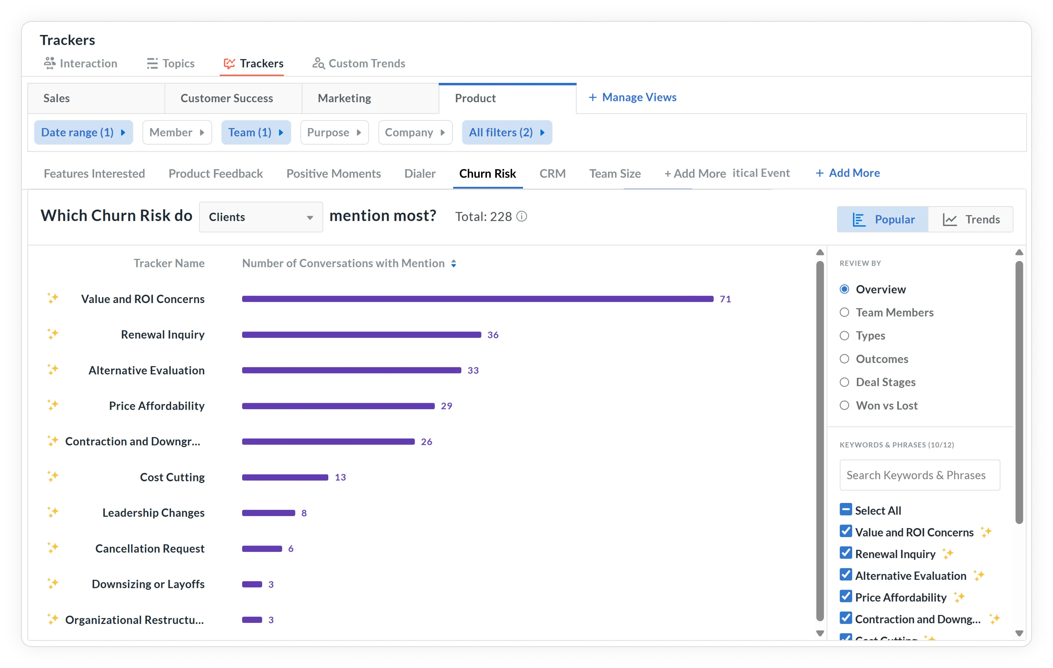 Smart trackers detect themes across your team's calls, including competitor mentions, pricing objections, feature requests, and buying signals.